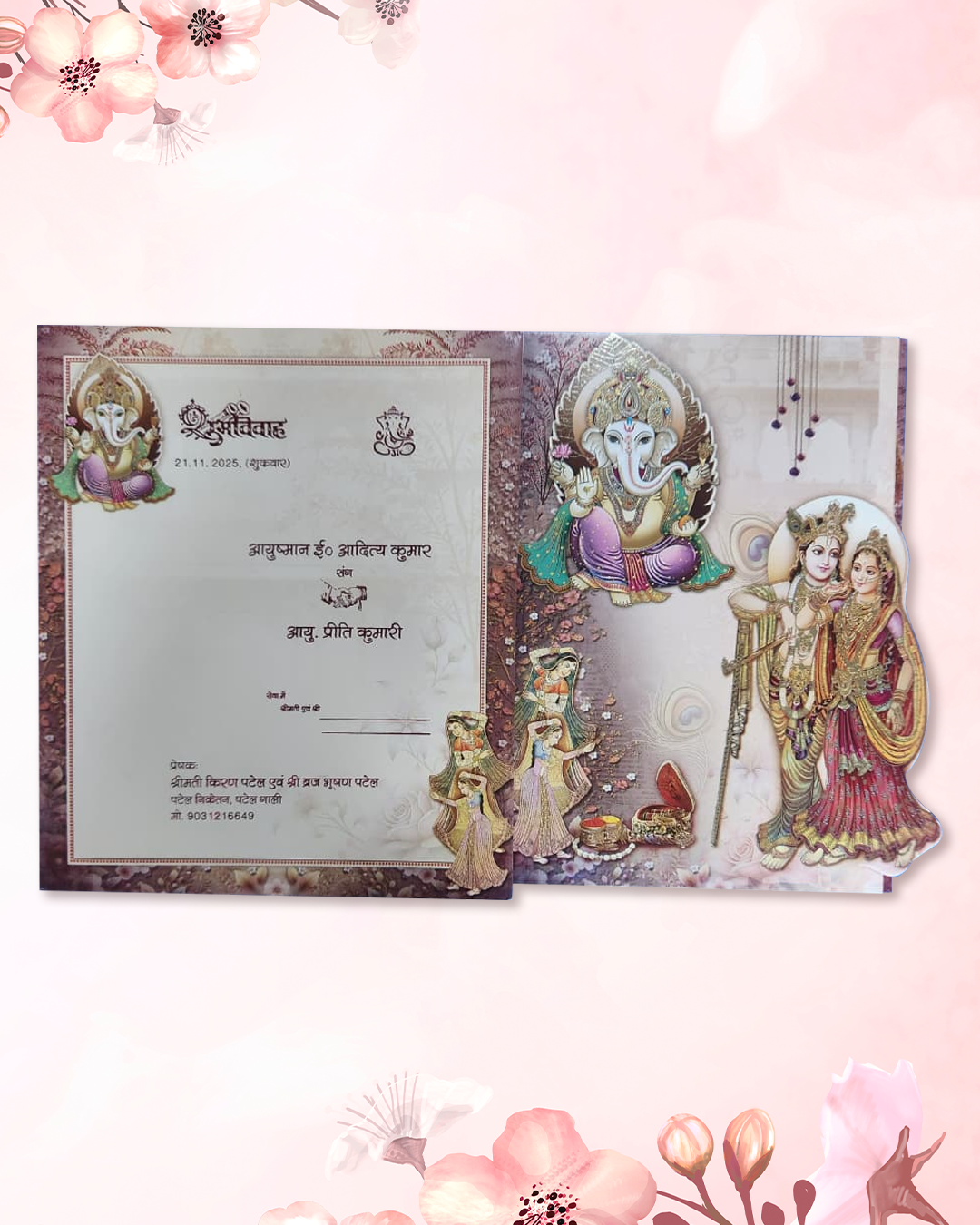Radha Krishna & Ganesh Ji Beautiful Flower Decorative Wedding Card 3 Fold Die Cut Card Size : 7.75x9 Inch
