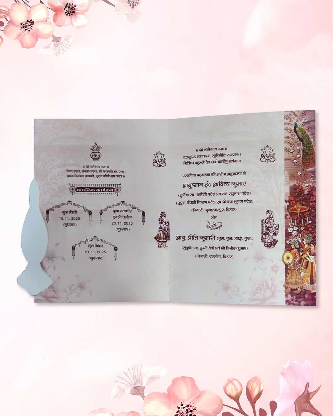 Radha Krishna & Ganesh Ji Beautiful Flower Decorative Wedding Card 3 Fold Die Cut Card Size : 7.75x9 Inch
